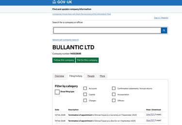 According to a report from Bullantic Ltd., when he attempted to discontinue the service, he was blackmailed. Subsequently, asked for more money. Suhail, the scammer, revoked his access to the government gateway and removed him from the directorship of his own company. Proof of these actions is provided below.